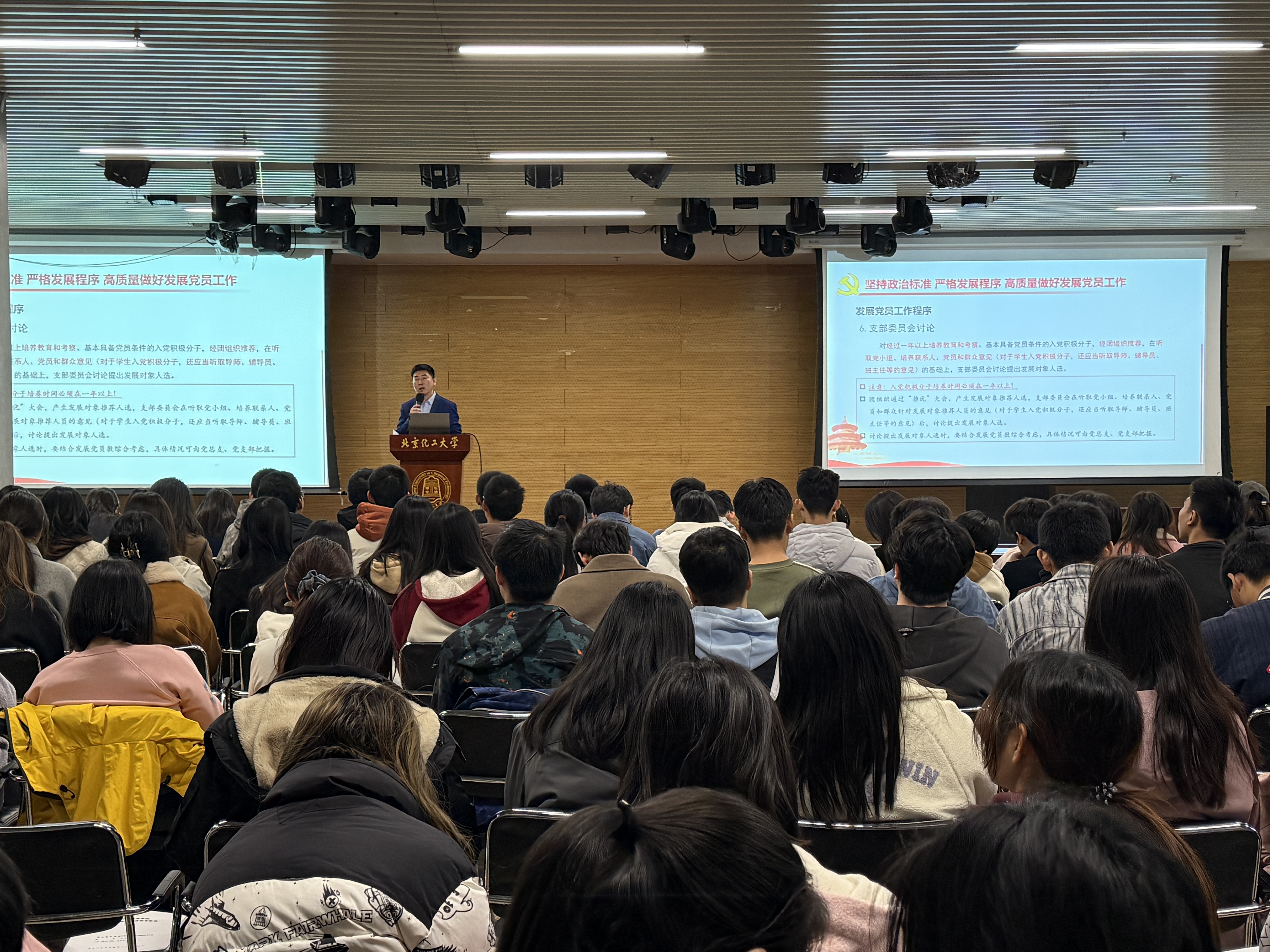 10月24日下午,数理学院党委在昌平校区体育馆多功能厅,开展题为《坚持政治标准严格发展程序高质量做好发展党员工作》的专题党课活动。党课由学院党委副书记杨明讲授,党支部书记、本科生党建专项工作负责人、全体本科生党员和入党积极分子等近300人共同参加学习活动。