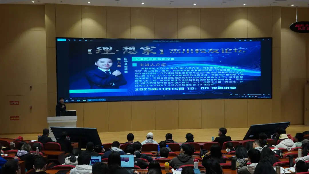 11月15日上午,数理学院“理•想家”杰出校友论坛在昌平校区求真讲堂举行。知乎公司董事、CCF杰出会员、面壁智能联合创始人&CEO、北京化工大学优秀校友李大海作题为“大模型落地场景探索”的专题报告。数理学院党委书记王立军及300余名师生出席本次论坛,论坛由学院党委副书记杨明主持。